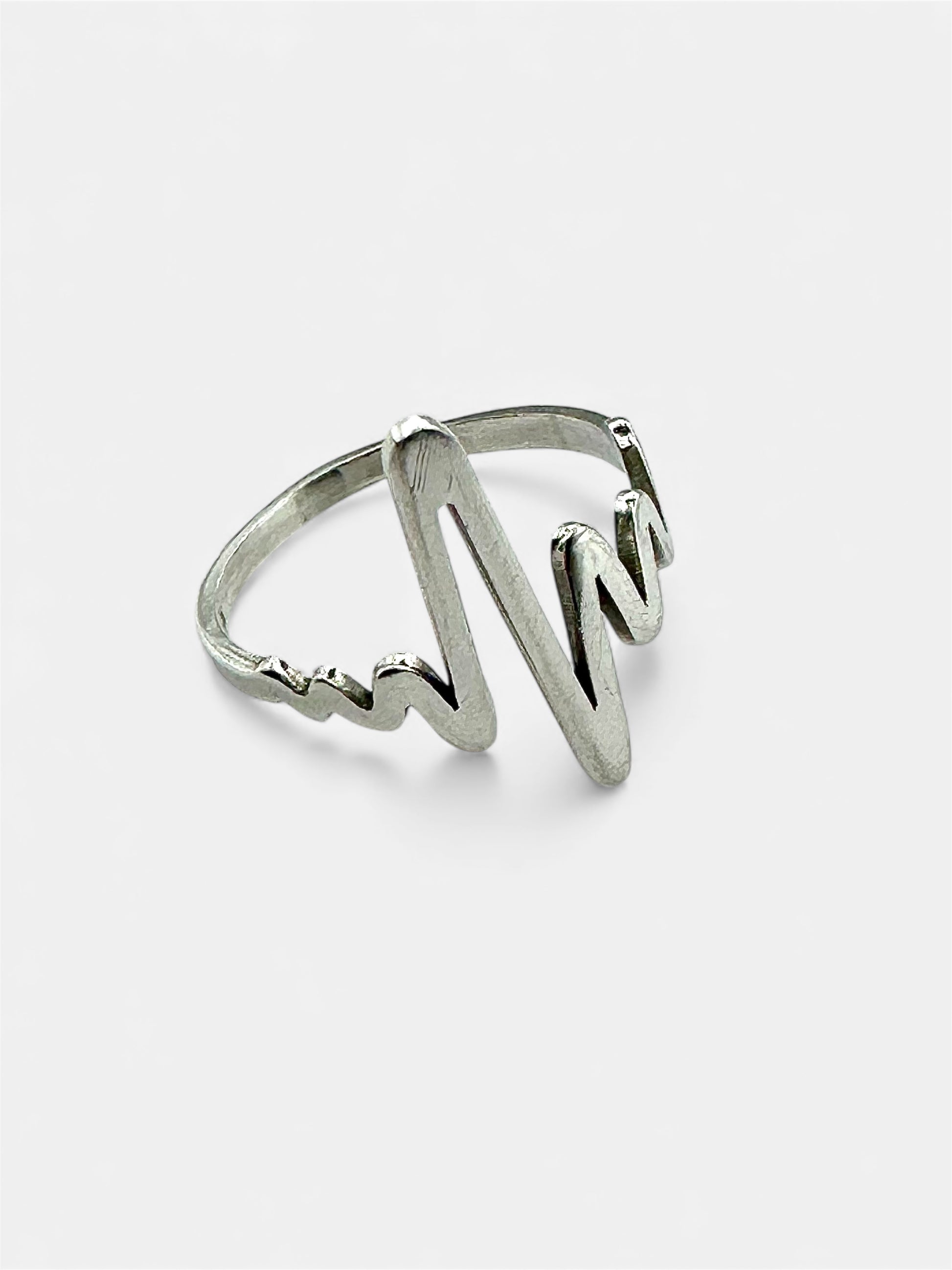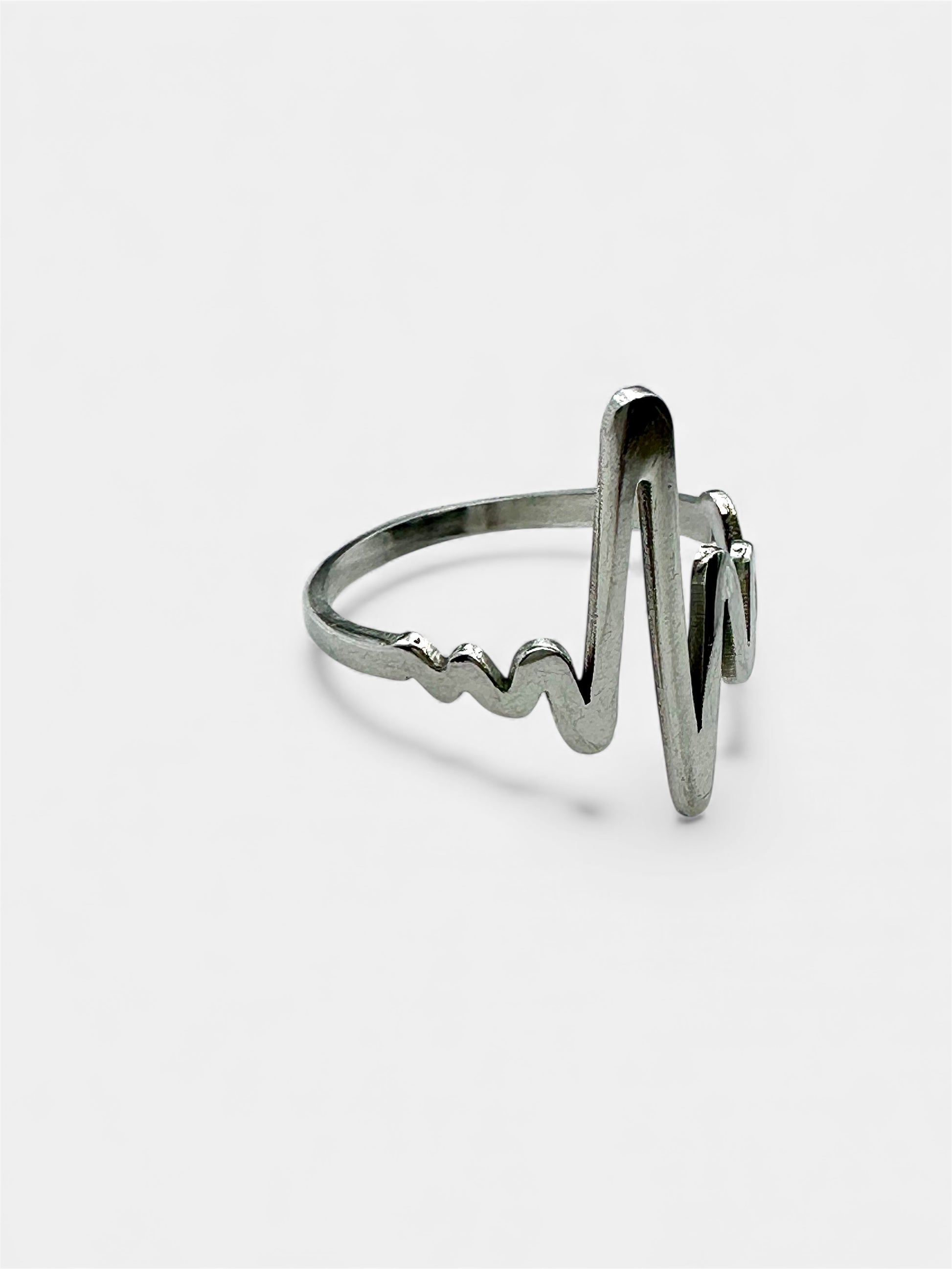 Anello moderno e simbolico in metallo lucido color argento, caratterizzato da un delicato motivo a elettrocardiogramma modellato sulla fascia. Il design richiama il battito del cuore, simboleggiando vita, emozioni e legami profondi. Un gioiello elegante e significativo, perfetto da indossare ogni giorno o da regalare a una persona speciale come simbolo di affetto e vicinanza.