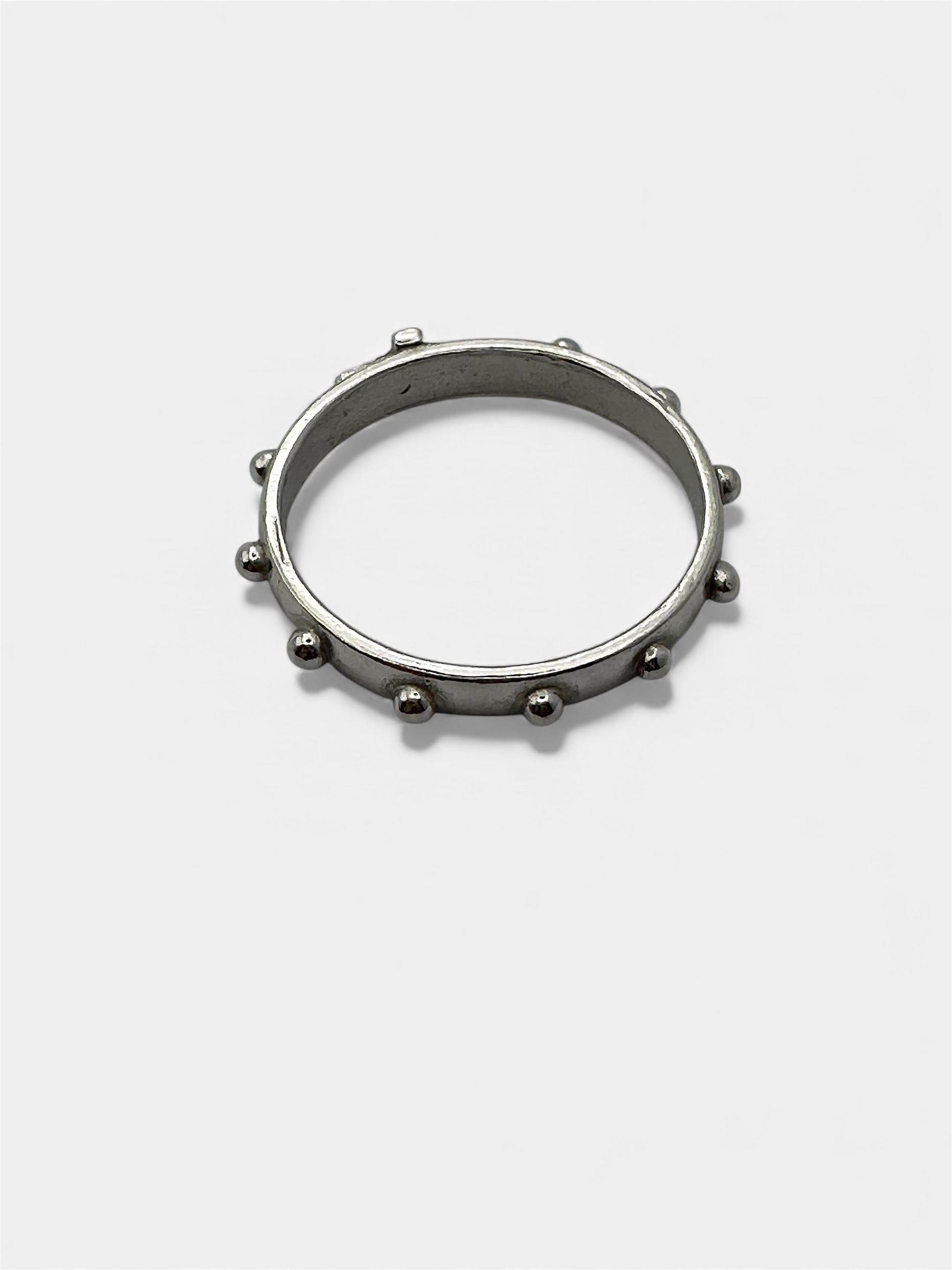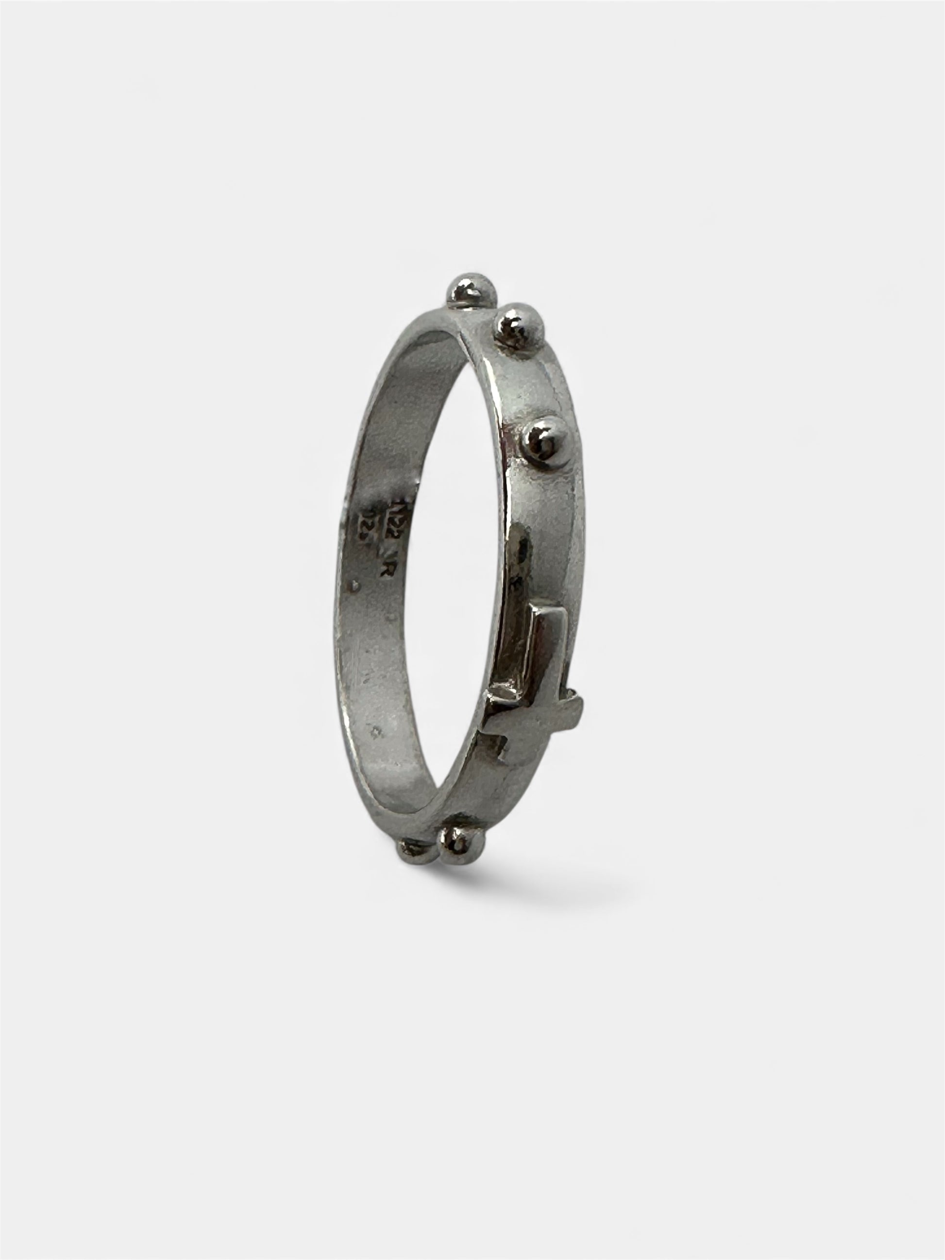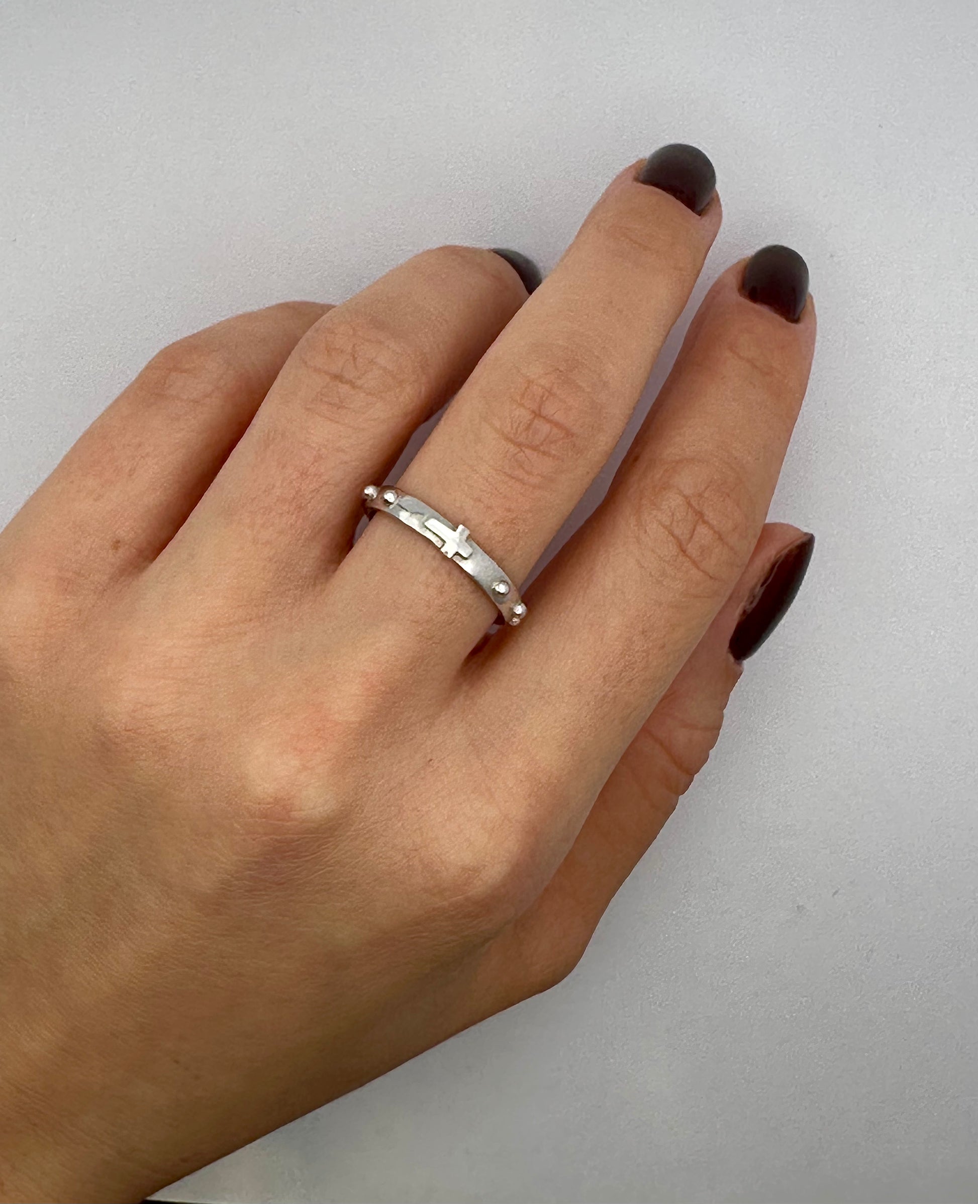 Anello a rosario realizzato in metallo lucido color argento, caratterizzato dalla presenza di piccole sfere in rilievo che richiamano i grani del tradizionale rosario. Il design è semplice e simbolico, pensato per chi desidera portare sempre con sé un segno di fede e devozione. Leggero, confortevole e adatto all’uso quotidiano, questo anello unisce spiritualità ed eleganza in un unico prezioso dettaglio.