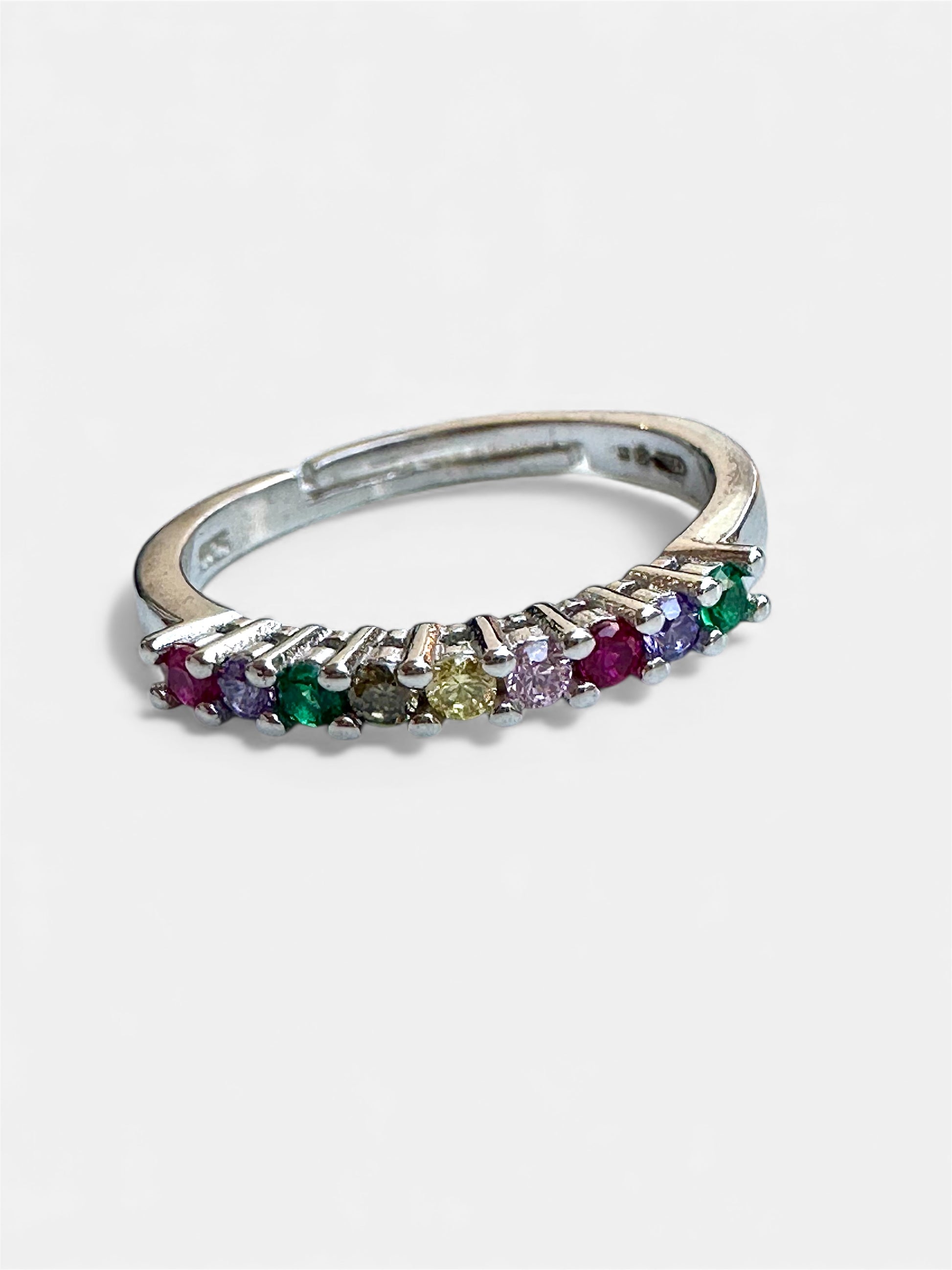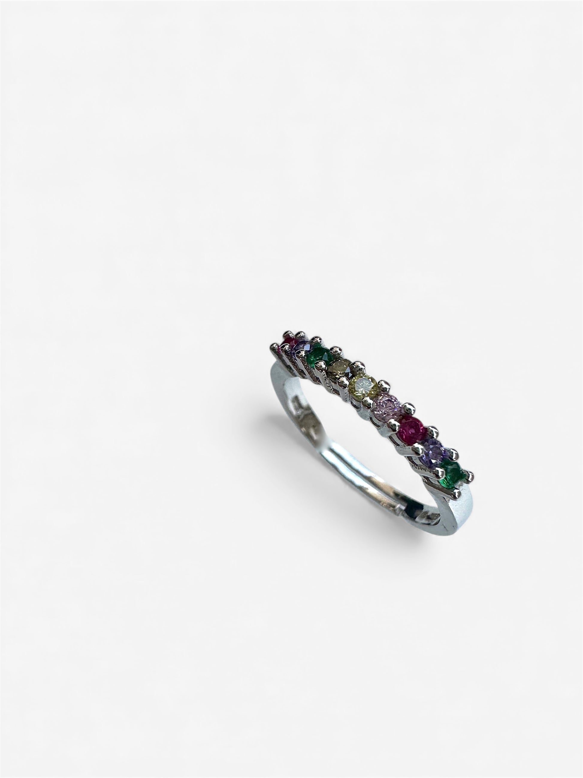 Anello Veretta con cubic zirconia colorati in riferimento alle tonalità dell’arcobaleno: presenta una sequenza di pietre colorate incastonate lungo il gambo, creando un effetto luminoso e vivace. Ogni pietra contribuisce a un gioco di colori armonioso, rendendo il gioiello moderno, brillante e ricco di personalità.