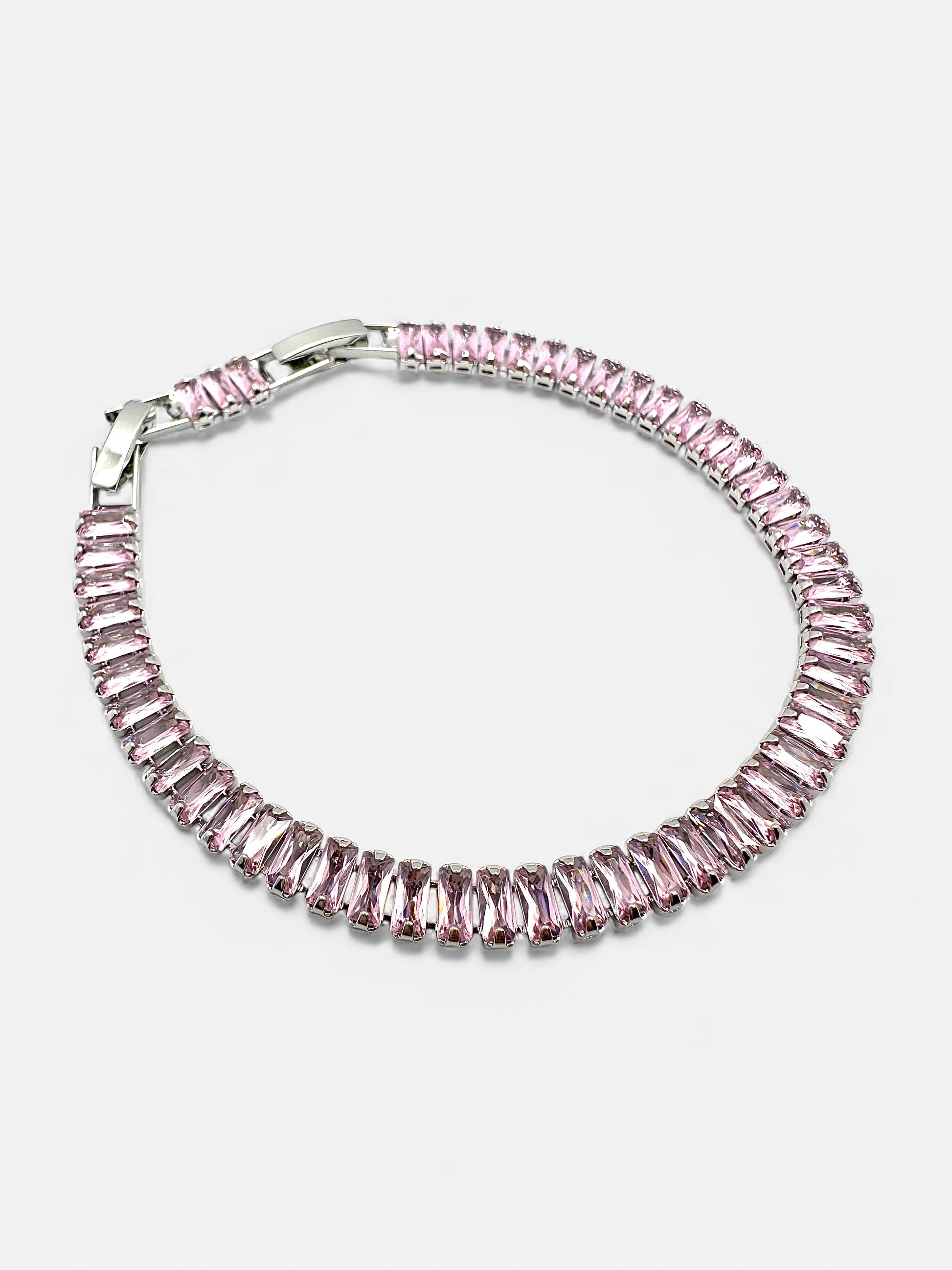 Bracciale tennis raffinato impreziosito da zirconi rosa con taglio baguette, incastonati uno ad uno per creare una linea continua di luce delicata e sofisticata.