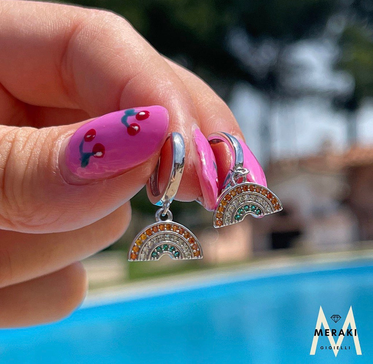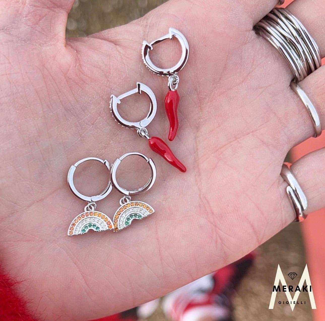 Orecchini a cerchietto con zirconi e pendente arcobaleno o corno rosso portafortuna