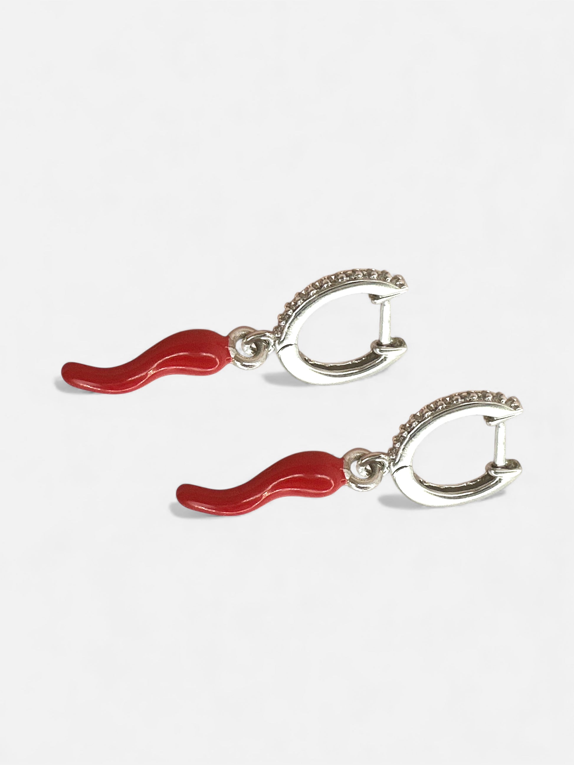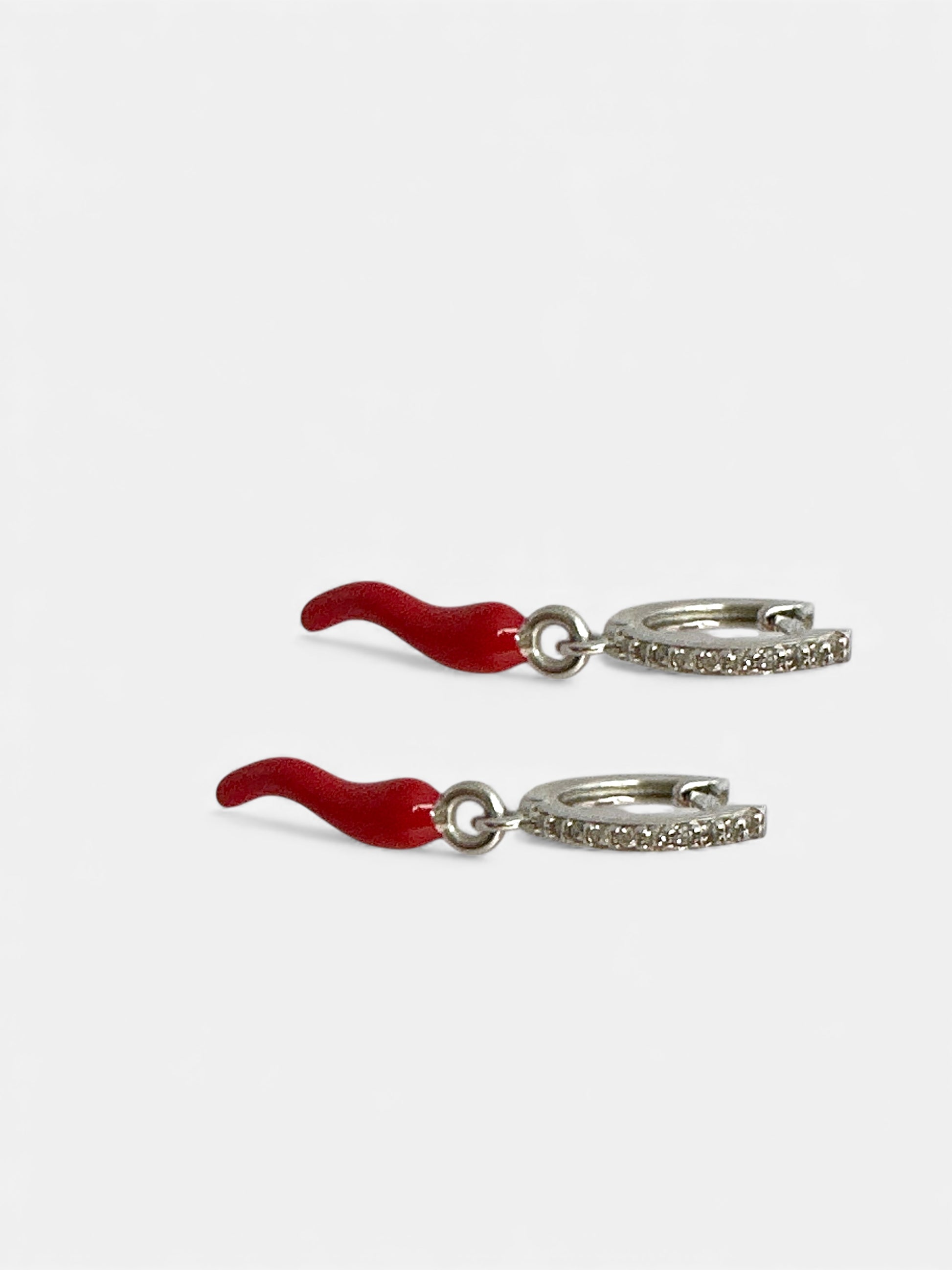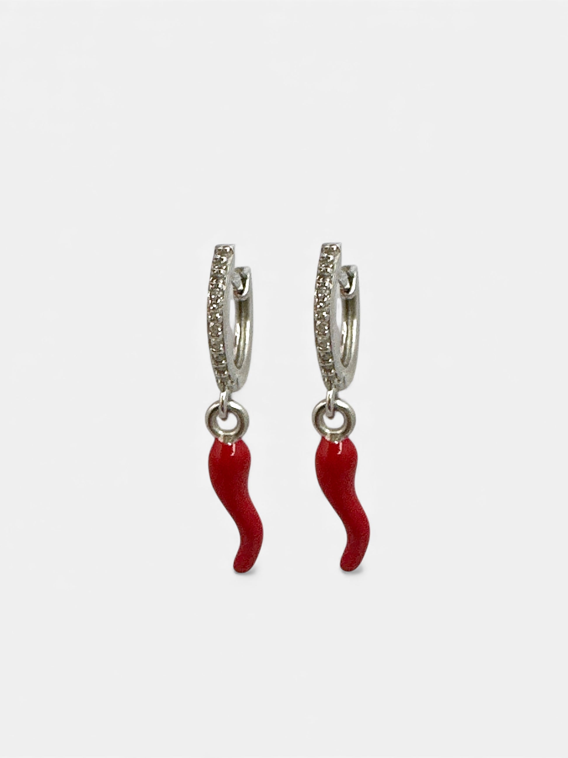 Un cerchietto luminoso tempestato di zirconi che abbraccia la luce a ogni movimento, impreziosito da un delicato corno rosso pendente, simbolo di buon auspicio e dolce protezione. Un gioiello che unisce eleganza e sentimento, da indossare come piccolo talismano del cuore.