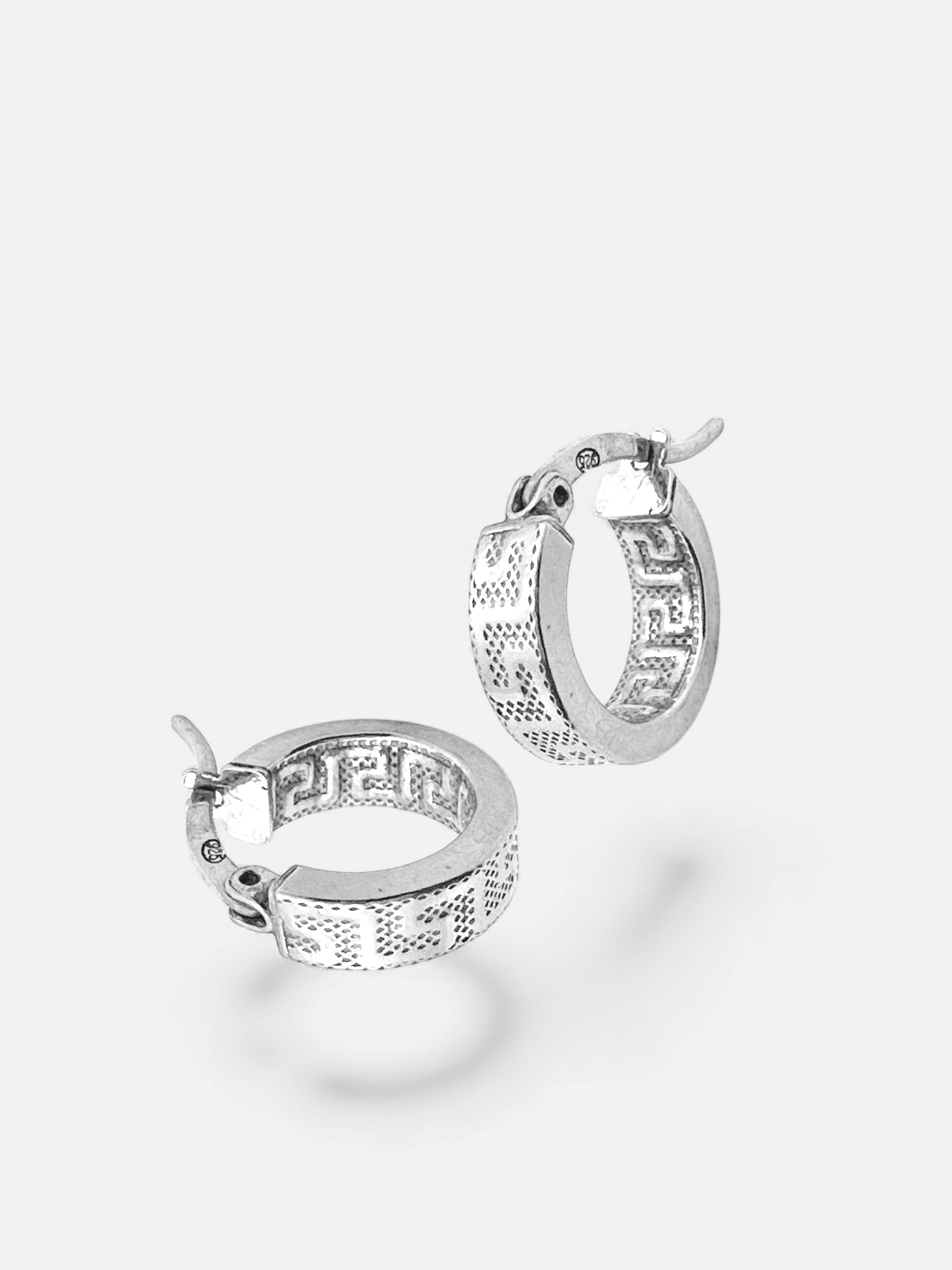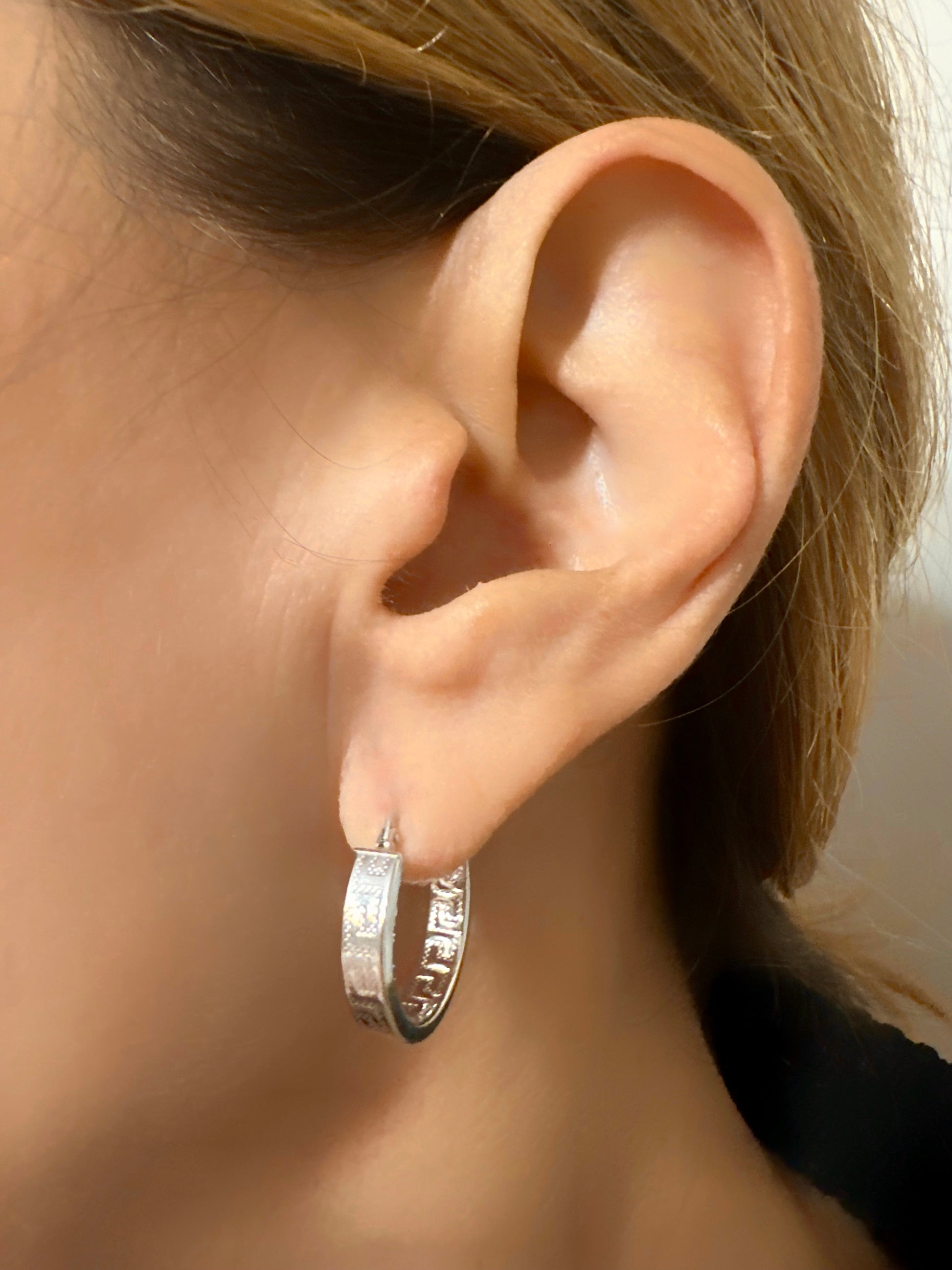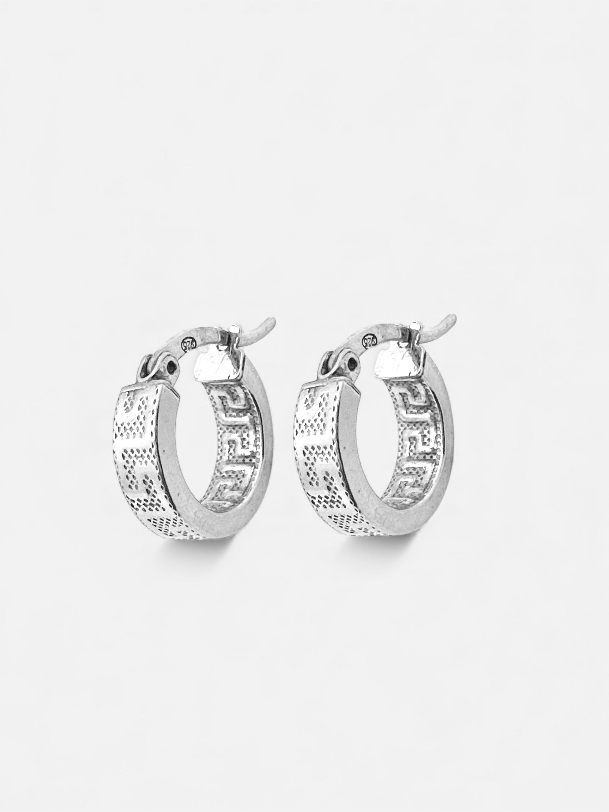 Questi cerchi piccoli con motivo greca uniscono stile e raffinatezza in un design compatto e luminoso. Il dettaglio inciso della greca aggiunge carattere e modernità, mentre la dimensione discreta li rende perfetti per un look curato e contemporaneo, da indossare ogni giorno. Il design squadrato dona un carattere distintivo al gioiello.